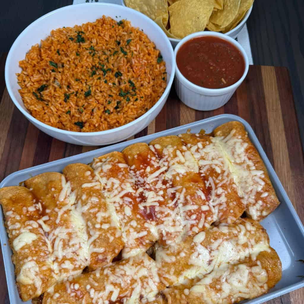 Once the cheese is melted, it’s time to eat! I served these enchiladas with some easy Spanish Rice, refried beans, chips, salsa, and homemade pomegranate guacamole!