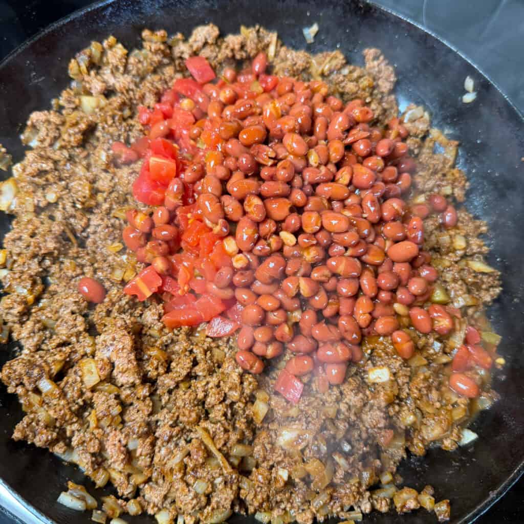 - Heat a large skillet over medium-high heat and brown 1 lb of ground beef with a chopped onion. Season with Chili seasoning. You can use a chili seasoning packet or the seasoning blend I have listed. Stir everything together well. Once the beef is fully cooked, drain any extra grease from the skillet.
